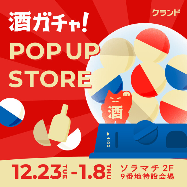 KURAND株式会社(本社:東京都足立区、代表取締役:荻原恭朗)は、弊社が運営するオンライン酒屋「クランド」のポップアップストア「クランド 酒ガチャ POP UP STORE」を、2025年12月23日(火)~2026年1月8日(木)の期間限定で東京ソラマチ(東京都墨田区)にて開催します。「酒ガチャ」が体験できるポップアップストアを開催