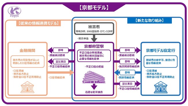 京都モデルは、各都道府県警察が実施している従来の金融機関との情報連携に加え、京都府警察と協定行がリアルタイムに情報を共有することで、詐欺に利用された口座や詐欺被害者を迅速に特定する仕組みです。