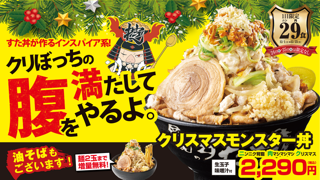 また、丼だけではなく、『クリスマスモンスター油そば』もご用意いたしました。『クリスマスモンスター油そば』は麺2玉まで増量無料のため、ニンニクのパンチが効いた肉と具材、小麦の風味香る全粒粉麺をボリューム感満載でお楽しみいただけます。