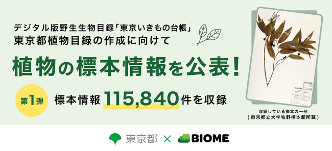 株式会社バイオーム(以下、バイオーム)は、東京都との協定のもとネイチャーポジティブの実現に向けて、都内の野生生物情報が一目でわかるデジタル版野生生物目録「東京いきもの台帳」の作成を進めています。このたび、東京の植物相の解明に向けた第一歩として、植物の標本情報115,840件を本日2025年12月16日(火)に公表します。今後は、標本のほか、文献や市民科学調査、専門家調査により情報の蓄積・公表を進めていきます。