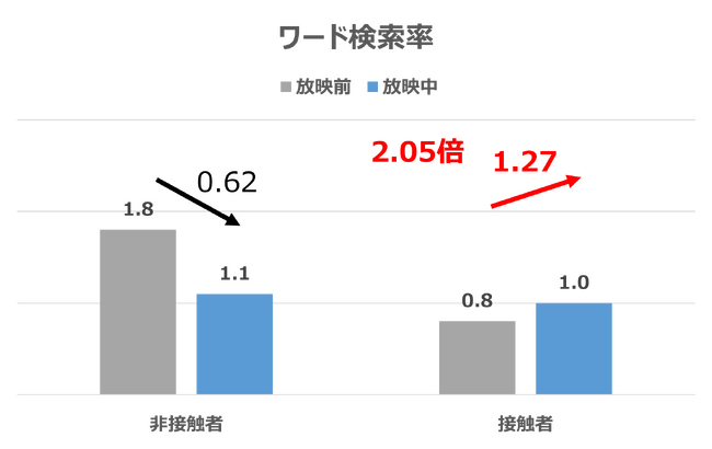 男性で検索行動が顕著だった点においては、放映商材の性質から興味・関心が比較的男性で高いと推測でき、広告接触によりさらに興味・関心を高めることに繋がったと考えられます。