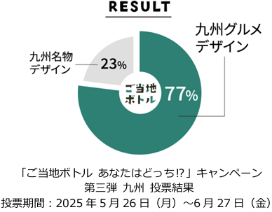 本キャンペーンは、2つのデザイン案からどちらかにご投票いただき、得票数が多かったデザインを特定の地域の『ご当地ボトル』として製品化する企画です。第三弾の九州のご当地デザインは、九州の自慢の食べ物をイラスト化した「グルメデザイン」と、様々な九州の名物をイラスト化した「名物デザイン」の2種類から投票いただき、77%もの得票率を獲得した「グルメデザイン」に決まりました。