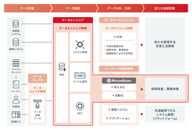 この課題解決に向け、製造現場の技術者をデータエンジニアとして育成し、IT部門に依存せず自ら課題を解決できる人材育成などの体制づくりに取り組み、そのデータ活用基盤として「MotionBoard」を導入しました。