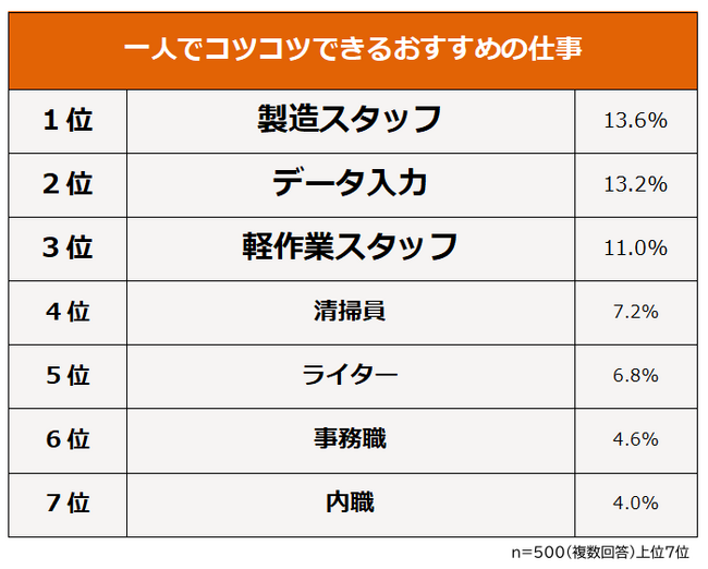 【一人でコツコツできる仕事ランキング】経験者500人アンケート調査