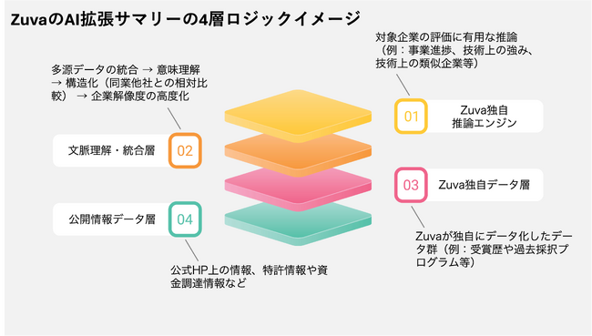 [画像2: https://prcdn.freetls.fastly.net/release_image/47908/26/47908-26-f0fa27c6de2af46264b680d625a77428-1024x768.png?width=536&quality=85%2C75&format=jpeg&auto=webp&fit=bounds&bg-color=fff ]Zuva株式会社は、国内外のスタートアップデータベース事業と、R&D部門や新規事業部を対象とした協業先調査・技術探索支援・マッチング支援を中心に事業展開するリサーチテクノロジー企業です。国立研究開発法人科学技術振興機構(JST)のSTARTプログラム採択を起点に創業し、世界のスタートアップに紐づいたディープテック/エマージングテクノロジー領域に特化したデータ基盤と分析知見を高度化。大学・研究機関・グローバルスタートアップやVCとのネットワークを強みに、企業の技術戦略・投資戦略を支えています。これまでに100社超の企業への支援実績を有し、その精度と網羅性は多方面で高く評価されています。