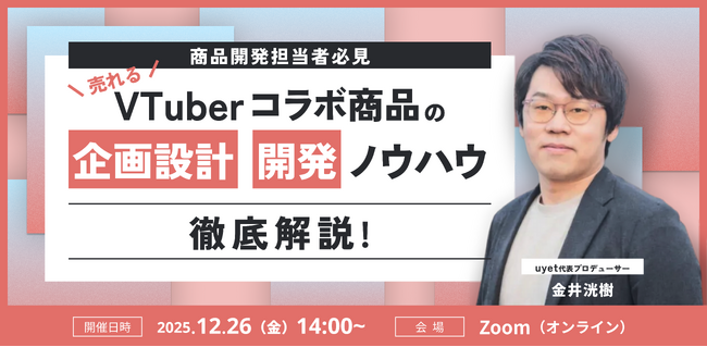 VTuber、IPコンテンツを通して日本と世界で新たな流通を生み出す“IPコンテンツの総合商社”株式会社uyet(ユエット)(本社:東京都渋谷区、代表取締役:梶田大樹)は、12月26日(金)14時より、VTuberの活用を検討している企業様向けのウェビナー「【企業担当者必見】売れるVTuber”コラボ商品“の企画設計、開発ノウハウを徹底解説!」を開催します。