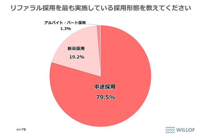 【リファラル採用を最も実施している採用形態】を聞いたところ、「中途採用(79.5%)」が最も多く、次いで「新卒採用(19.2%)」という結果になりました。リファラル採用は、即戦力を求める中途採用において特に有効な手法として活用されていることが分かります。