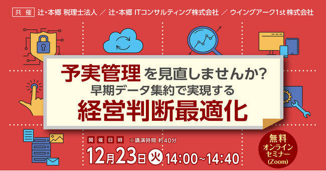 辻・本郷 税理士法人(本社:東京都新宿区、理事長:桑木小恵子)は、辻・本郷 ITコンサルティング株式会社(本社:東京都渋谷区、代表取締役社長:黒仁田健)と、ウイングアーク1st株式会社(本社:東京都港区、代表取締役 社長執行役員CEO:田中潤)と共催で、2025年12月23日(火)に無料オンラインセミナー「予実管理を見直しませんか? 早期データ集約で実現する経営判断最適化」を開催いたします。本セミナーでは、「経営判断に直結する予実管理」を実現したいすべてのビジネスパーソンに向けて、企業の成長を阻む課題と、その具体的な改善ポイントを解説します。また、部門横断的なデータ統合を可能にし、予実の全体像を直感的・リアルタイムに可視化するBIツール「MotionBoard」の活用事例もご紹介します。これからの予実管理の最前線をイメージいただき、スピーディかつ正確な意思決定を実現するためのヒントとなる内容です。