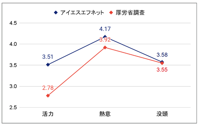 - 「ワークエンゲージメント」の「活力」「熱意」「没頭」の全3項目で厚生労働省が公表している調査結果(※)を上回る