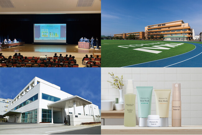 左上から時計回りに、全体報告会の様子/東海大学付属浦安高等学校/マナビス化粧品5点セット/株式会社マナビス社屋