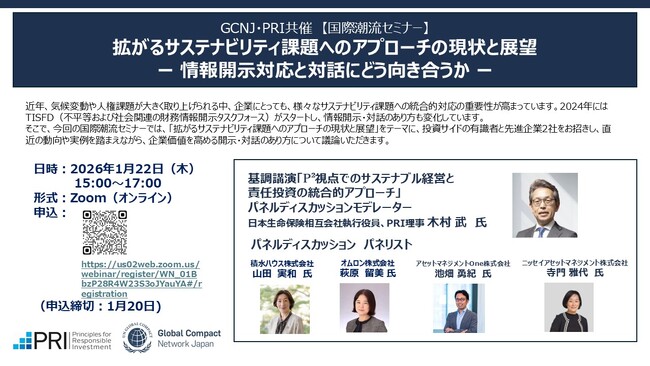 一般社団法人グローバル・コンパクト・ネットワーク・ジャパン(GCNJ)は2026年1月22日(木)、PRI(Principles for Responsible Investment:責任投資原則)と合同で、「拡がるサステナビリティ課題へのアプローチの現状と展望 ー情報開示対応と対話にどう向き合うかー」と題する国際潮流セミナーをオンライン開催します。