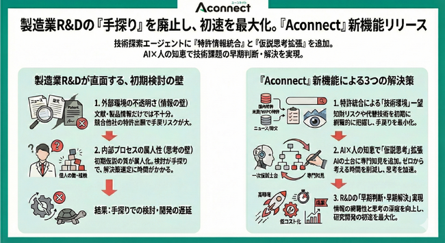 製造業R&Dの「手探りでの検討」を廃止し、研究開発の初速を最大化 『Aconnect』の技術探索エージェントに特許情報統合と仮説思考拡張機能をリリース