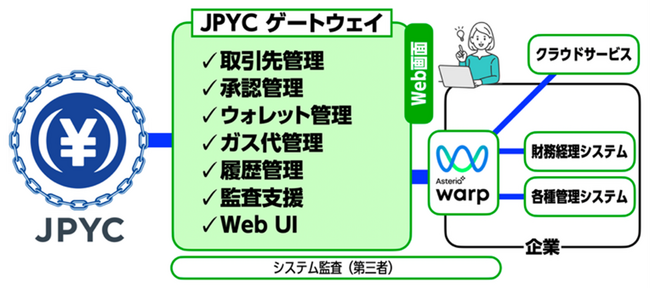[画像2: https://prcdn.freetls.fastly.net/release_image/10008/391/10008-391-b630f7de234606649f32e2256470890e-1005x1030.png?width=536&quality=85%2C75&format=jpeg&auto=webp&fit=bounds&bg-color=fff ]このたびアステリア株式会社様より『JPYCゲートウェイ』が発表されたことを、大変歓迎しています。『JPYCゲートウェイ』は、JPYCの企業利用において課題となっていたポイントを、現実的に解決する取り組みです。本製品を通じて、企業が日常業務の中で安全かつ自然にJPYCを活用できる環境が整うことを期待しています。JPYC株式会社としても、アステリア様との連携を強化し、日本におけるステーブルコインの社会実装をさらに推進してまいります。