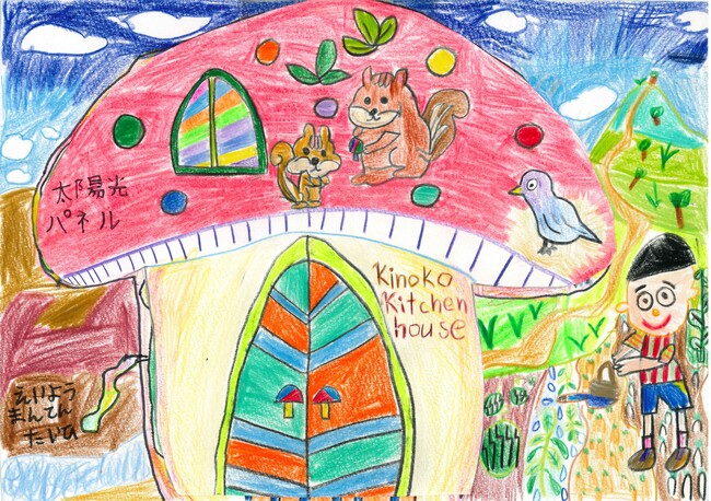 最優秀賞は、脇田良太郎さん(大阪教育大学附属天王寺小学校 3年生)の「KinoKo Kitchen house」。エネルギー循環の仕組みが具体的に示されていることにくわえ、きのこの菌糸体の性質を調べ、高い強度を発揮するという特徴を最大限活かして建物をつくるという着眼点に、審査員の高い評価が集まりました。そのほかにも、描かれているきのこをめくると家族の笑顔あふれるキッチンが現れるしかけ、豊かな色彩感覚で仕上げたイラストであることも評価されました。