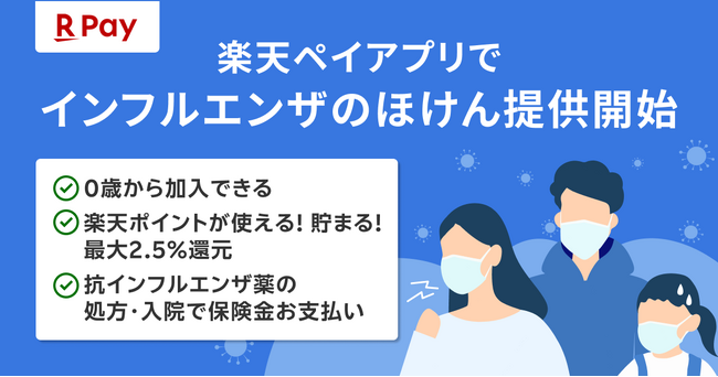 楽天ペイメント株式会社(以下「楽天ペイメント」)と楽天少額短期保険株式会社(以下「楽天少短」)は、キャッシュレス決済サービス「楽天ペイ」アプリにおいて、「インフルエンザのほけん」の提供を本日より開始することをお知らせします。