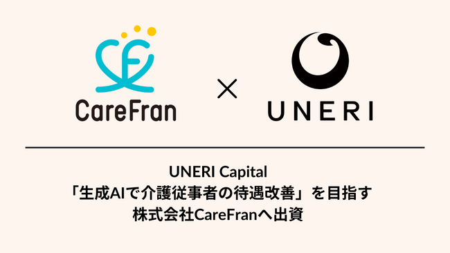 株式会社UNERI(本社:愛知県名古屋市、代表取締役:河合 将樹)は、運営するファンドUNERI Capitalを通じて、株式会社CareFran(本社:東京都千代田区、代表取締役:久保田 洋介、以下「CareFran」)への出資を実施したことをお知らせします。