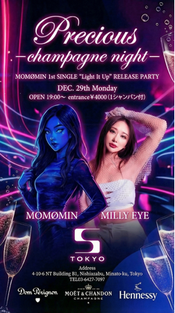 国内外のクラブシーンで確実に存在感を高めつつあるMOMØMIN、そして多彩な表現力で支持を集めるMILLY EYEを迎え、2025年の東京ナイトシーンを締めくくる一夜が実現します。シャンパンが華を添える洗練された空間の中で、新たなムーブメントの始まりを体感できる一夜。 音楽ファン、カルチャー感度の高いオーディエンス必見のイベントです。