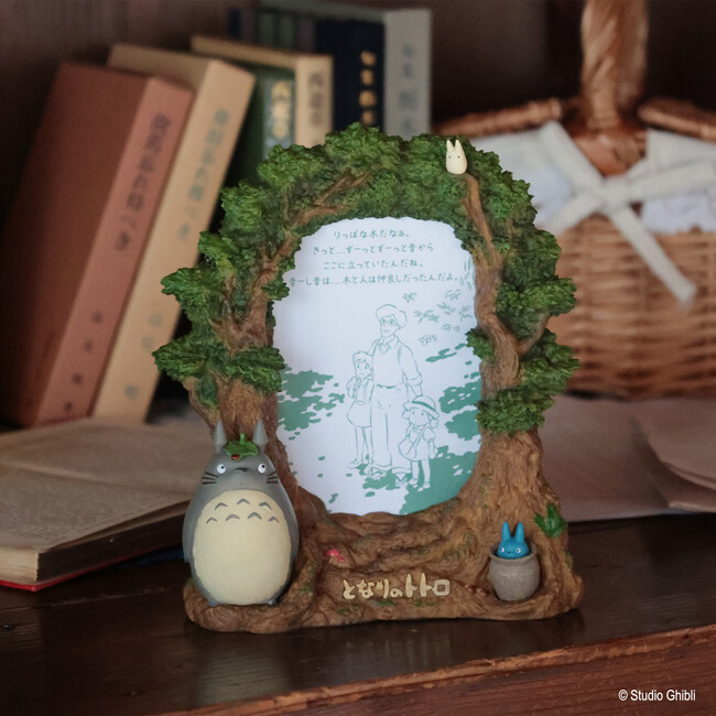 中に入れた写真が木々に囲まれたように見える「となりのトトロ フォトフレーム トトロの森」は、幹の質感や葉っぱの彩色にこだわり、映画の世界観を表現しました。フレームの左には頭に葉っぱを乗せたトトロ、右側には木の根の間のつぼに隠れた中トトロ、木の上には小トトロがいて、それぞれフォトフレームの中心部に視線を送っています。お気に入りの写真を入れると、トトロたちが覗き込んでいるようすを楽しめる、遊び心のあるデザインです。
