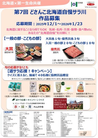 北海道と第一生命保険株式会社は、包括連携協定に基づく取組として、第一生命保険(株)が実施するサラ川こと「サラッと一句!わたしの川柳コンクール」の北海道版である「第7回どさんこ北海道自慢サラ川(川柳)」を実施し、北海道のPRにつながるユニ ークな作品を募集しております!