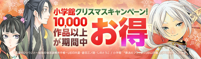 「ebookjapan」では、本日12月19日(金)から、『葬送のフリーレン』(原作:山田鐘人 作画:アベツカサ/小学館)や『薬屋のひとりごと~猫猫の後宮謎解き手帳~』(原作:日向夏 作画:倉田三ノ路 キャラクター原案:しのとうこ/小学館)など小学館の話題作、人気作がお得に楽しめる「小学館クリスマスキャンペーン」を開催します。