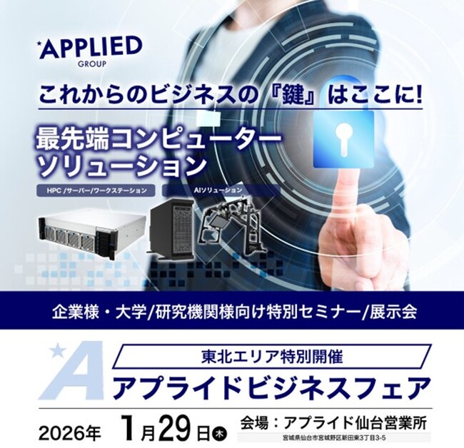 アプライド株式会社(本社:福岡県福岡市、代表取締役社長:岡義治)は、2026年1月29日(木)にアプライド仙台営業所にて、法人様、個人事業主様、大学・専門学校様を対象とした「これからのビジネスの『鍵』はここに!最先端コンピューターソリューション アプライドビジネスフェア(東北エリア特別開催)」を開催いたします。本イベントでは、最新のAI技術、ビジネスコンピューター、ワークステーション、サーバーソリューションに関する展示・商談会と、専門家による無料セミナーを実施し、ビジネスの課題解決とDX推進を支援いたします。