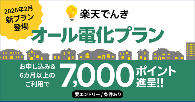 楽天モバイル株式会社(以下「楽天モバイル」)は、2026年2月25日(水)より、個人・家庭向け低圧電力供給サービス「楽天でんき」において、オール電化住宅をご利用のお客様の効率的な電力のご利用を後押しする新料金プラン「オール電化プラン」(以下「本プラン」)を提供開始します。また、本プランの事前エントリーの受付を開始し、本プランを6カ月以上ご利用いただいたお客様を対象に、最大「楽天ポイント」7,000ポイントを還元するキャンペーンを実施します(注1)。