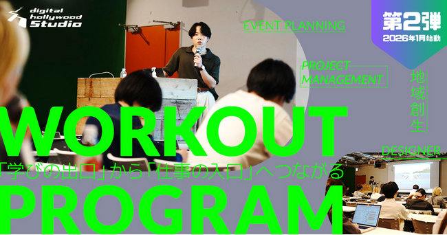 IT関連及びデジタルコンテンツの人材育成スクール[デジタルハリウッド] (運営会社:デジタルハリウッド株式会社、本社/本校:東京都千代田区、代表取締役社長兼CEO:春名啓紀、学長:杉山知之)では、運営をする、新しい学びのスタイルを通して多様なライフスタイルを支援し全国へ展開している、Webと動画について学べるラーニングスタジオ『デジタルハリウッドSTUDIO』のSTUDIO渋谷では、第一線で活躍する企業やクリエイターと受講生が出会い、学び、共創できる「ワークアウトプログラム」を展開しています。