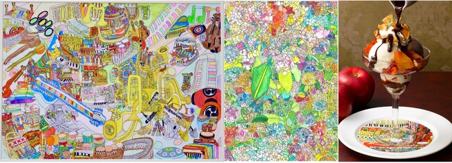 アーティスト独自の繊細な感性で描かれた、多種多彩なコスモスと山の色の移り変わりを描いた秋らしい彩りが、マロンデザートと見事に調和し、季節の深まりを感じさせるデザートの魅力を一層引き立てました。