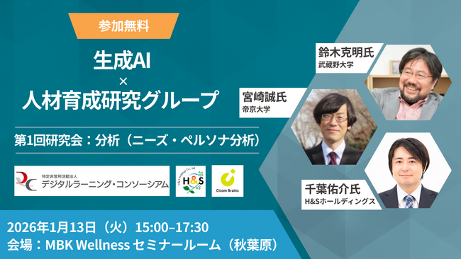 国内外で企業の人材育成を支援するMBK Wellness 株式会社 サイコム・ブレインズ事業本部(東京都千代田区、事業本部長 勝 幹子)は、2026年1月、特定非営利活動法人デジタルラーニング・コンソーシアム(DLC)および 、H&Sホールディングス株式会社と連携し、「生成AI×人材育成研究グループ」を発足いたします。