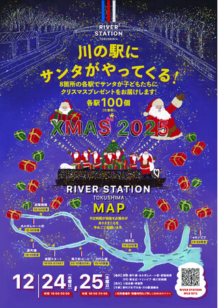 イルミネーションで彩られたひょうたん島周遊船に乗ったサンタクロースが、川の駅・停留所候補地の桟橋周辺8カ所を巡回し、各日各所先着100人の子どもたちにプレゼントを配布してくれます。徳島市の地域資源「ひょうたん島」を中心とした水を生かしたまちづくりを進めることで、にぎわいを創出することを目的とする事業「ひょうたん島川の駅ネットワーク推進事業」の一環として、NPO法人新町川を守る会とひょうたん島川の駅連絡会(事務局:中心市街地活性化推進室)との共催で実施します。