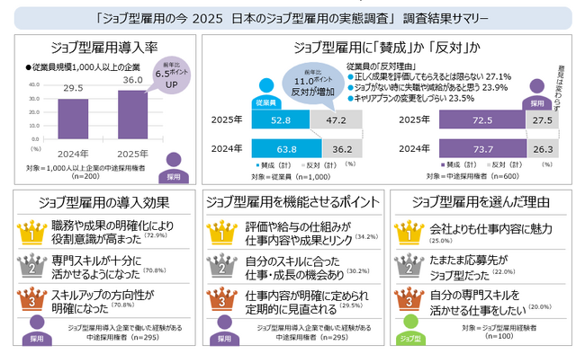 ジョブ型雇用の普及に対し、中途採用権者は約7割が「賛成」従業員は賛成と反対が拮抗し、前回より「反対」が11ポイント増加