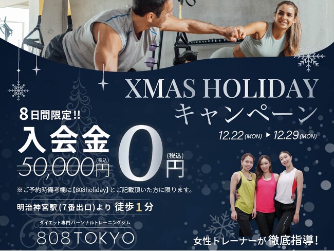 【クリスマス限定/8日間】ダイエット応援!入会金50,000円が0円に|原宿・表参道のダイエット専門パーソナルジム808TOKYO