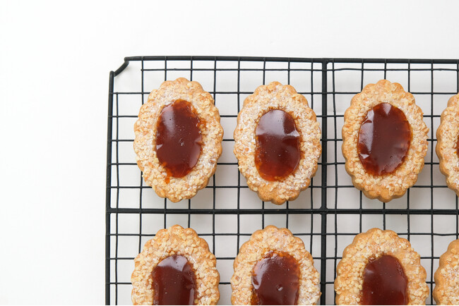 『とろり甘酸っぱいアプリコットクッキー』は、軽やかな生地の中央にアプリコットピューレをのせて焼き上げたクッキーです。艶のある果実が映えるフォルムは、鏡を思わせるような佇まいで、手に取った瞬間に目を引きます。