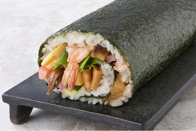 ◯商品説明:海老・穴子など12種類もの具材を巻いた、一口ごとに違う味がお楽しみいただける極太巻です。