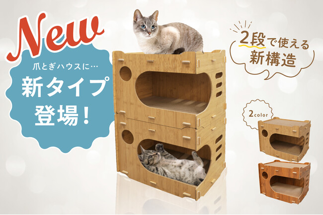 【新発売!】猫用「爪とぎハウス」に新タイプ登場。2段まで重ねて使える新構造で多頭飼いにも対応、選べる2色展開に進化。発売を記念し、期間限定でお得にお試しいただける15%OFFクーポンを配布中です。