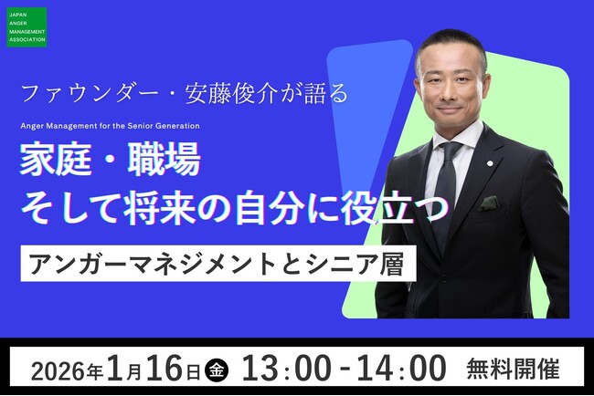 【1月16日(金)13:00開催】反響多数につき再配信決定!ファウンダー・安藤俊介が語る「家庭、職場、そして将来の自分に役立つ!アンガーマネジメントとシニア層」無料オンラインセミナー