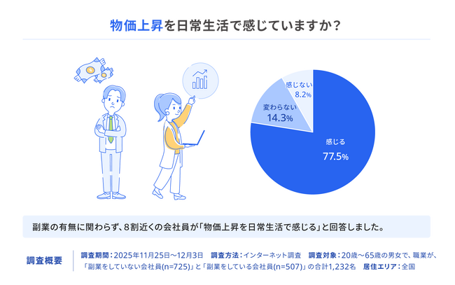 副業の有無に関わらず会社員として働く人に物価上昇を日常生活で感じているかについて聞いたところ、会社員の77.5%が「感じる」と回答し、「変わらない」が14.3%、「感じない」が8.2%という結果になりました。この結果により、会社員の8割近くが物価上昇の影響を認識していることがわかります。