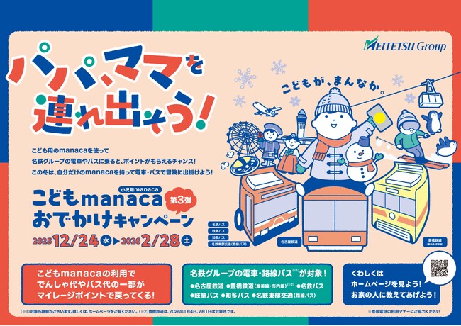 名古屋鉄道、豊橋鉄道、名鉄バス、岐阜乗合自動車、知多乗合、名鉄東部交通は、小児用manacaでご利用いただいた運賃の一部をmanacaマイレージポイントで還元する「こどもmanaca おでかけキャンペーン 第3弾」を実施します。