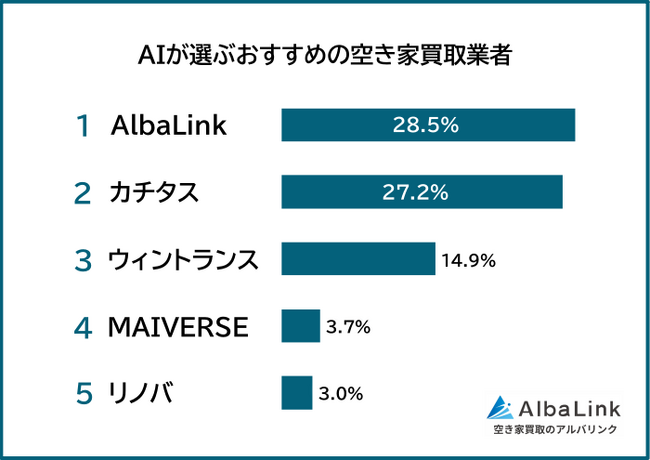 ChatGPTまたはGeminiを使っている404人に「空き家買取業者でおすすめの一社を教えて」と質問してもらったところ、AIが回答した空き家買取業者で最も多かったのは「AlbaLink(28.5%)」でした。