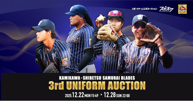 株式会社モバオク(本社:東京都渋谷区、代表取締役社長:小一原 宏樹、以下モバオク)がエンゲート株式会社(本社:東京都中央区、代表取締役:城戸 幸一郎、以下エンゲート)と業務提携し提供するスポーツチーム公式オークションサービス「スポオク」にて、プロ野球独立リーグ・北海道フロンティアリーグ所属のKAMIKAWA・士別サムライブレイズは2025年12月22日(月)より『KAMIKAWA・士別サムライブレイズ3rdユニフォームオークション』を開始します。