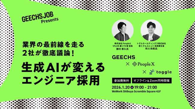 ギークス株式会社(本社:東京都渋谷区、代表取締役CEO:曽根原 稔人、以下ギークス)は、2026年1月20日(火)19:00~21:00にて、ITエンジニア採用担当者向けの無料セミナー「業界の最前線を走る2社が徹底議論!生成AIが変えるエンジニア採用」を開催します。