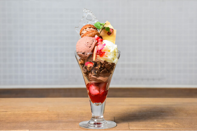3大陸3カ国のカカオ産地をめぐりながら苺を楽しむBean to Bar専門店ならではのチョコレートパフェ