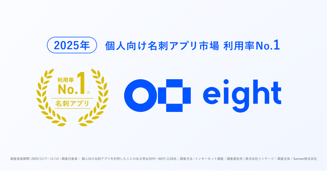 Sansan株式会社が提供する名刺アプリ「Eight」が、株式会社インテージに委託した個人向け名刺アプリに関する調査において、個人向け名刺アプリ市場で利用率No.1を獲得したことを発表します。なお、「Eight」は個人向け名刺アプリ市場において、3年連続で利用率No.1を獲得しています。