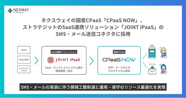 TISインテックグループの株式会社ネクスウェイ(本社:東京都江東区、代表取締役社長:坂本 倫史、以下:ネクスウェイ)は、国産CPaaS※1「CPaaS NOW」が、株式会社ストラテジット(本社:東京都港区、代表取締役社長:加藤 史恵、以下:ストラテジット)が提供するSaaS連携ソリューション「JOINT iPaaS」のSMS・メール送信コネクタ※2として採用され、2025年12月23日に実装されたことを発表します。