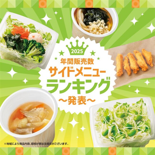 サイドメニューランキングの1位は『特製豚汁』、2位『7品目のミックスサラダ』、3位『ミニわかめうどん』、4位『手羽から揚(しお味)』、5位『たっぷりグリーンサラダ』でした。