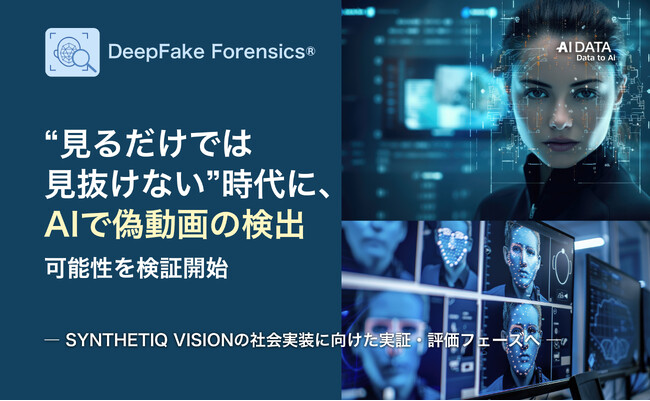 この課題に対し、企業データとAIの利活用カンパニー、AIデータ株式会社(本社:東京都港区、代表取締役社長 佐々木隆仁、以下AIデータ社)は、国立情報学研究所(NII)が開発した「SYNTHETIQ VISION」技術を活用した、AIフェイク映像検出の実現可能性に関する検証を開始しました。今後、検証結果や関係機関との議論を踏まえ、具体的なサービス形態や対象分野のあり方を慎重に検討してまいります。