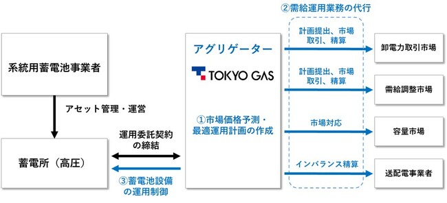 本サービスは、蓄電池を所有する事業者からの委託を受け、東京ガスが蓄電池設備を運用し、需給調整市場や容量市場などを対象とした市場取引を実施するものです。東京ガスが強みとする電力トレーディングにおける価格予測や運用ノウハウを活かし、市場取引を通じて収益の最大化を図ります。なお、東京ガスはこれまでも、特別高圧系統用蓄電池を対象として同様のサービスを展開[*1]しており、本サービスはその提供対象を高圧に拡張するものです。