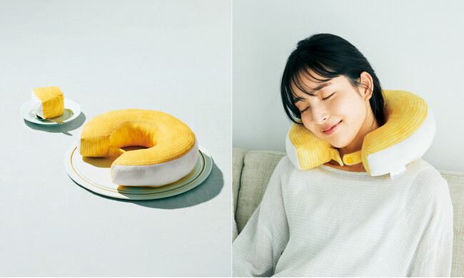 フェリシモが展開するユーモア雑貨ブランド「YOU+MORE!」は、不思議なしあわせ気分に包まれるネックピロー「バウムピロークーヘン 一切れのポーチを添えて」のウェブ販売を12月23日より開始しています。おいしそうなバウムクーヘンの穴にすっぽり入れる夢のようなピローの登場です。装着すると安定感もあって、乗り物での移動中はもちろん、おうちでのくつろぎタイムにもぴったりです。切り取られたひと切れは、ふだん持ち歩くのにちょうどよいサイズのポーチとして使えて、ネックピローといっしょにたっぷり楽しめる、おいしい2点セットになっています。