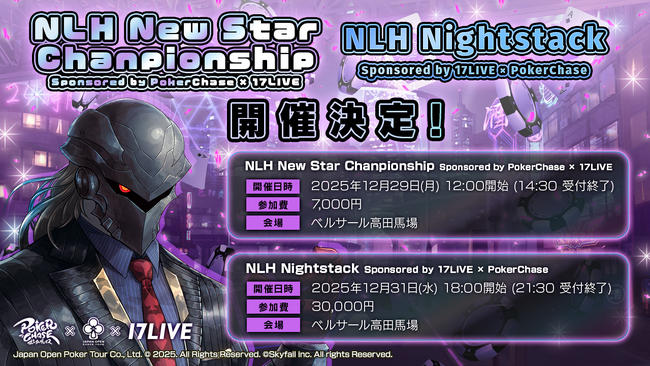 株式会社Skyfall(東京都港区 代表取締役社長:長谷川 智一、以下Skyfall)が運営するバトロワ式オンラインポーカーゲーム『ポーカーチェイス』は、ジャパンオープンポーカーツアー株式会社(東京都新宿区、代表: 亀井 翼、以下ジャパンオープンポーカーツアー)が開催するアジア最大級ポーカーイベント「JOPT 2026 Tokyo #01」にて、世界で5,000万ユーザーを誇る日本最大級のライブ配信アプリ「17LIVE(イチナナ)」と2025年12月29日(月)、12月31日(水)に冠トーナメントを開催することが決定しました。