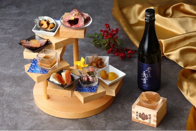 豊臣秀吉・秀長のゆかりの地として知られる名古屋市中村区に位置する当ホテルでは、2026年大河ドラマ『豊臣兄弟!』の放送にちなみ、百姓から天下人へと昇りつめた二人の軌跡を表現した特別メニューをご用意いたしました。豊國神社 近藤一夫宮司監修のもと、秀吉・秀長が好んだ食材や、当時食されていた食材を取り入れ、全八品で兄弟のサクセスストーリーを表現。階段状に下段から上段へと小皿が並び、ひと皿ずつ味わうごとに秀吉と秀長が駆け上がった出世の道のりをたどることができ、視覚的な演出とともに物語の高揚感や躍動感を感じられる、まさに“歴史を味わう”メニューに仕上げました。また、江戸時代末期創業の老舗酒造「日本泉」が醸す「純米吟醸 豊臣秀吉」は、枡酒でお楽しみいただけます。枡は、安土桃山時代に豊臣秀吉が行った「太閤検地」により基準が統一され、現代にも続く「一升」という単位を定着させたと言われています。料理と酒が織りなす深い風味がより際立ち、まさに“天下の宴”を思わせる豊かな時間が広がります。